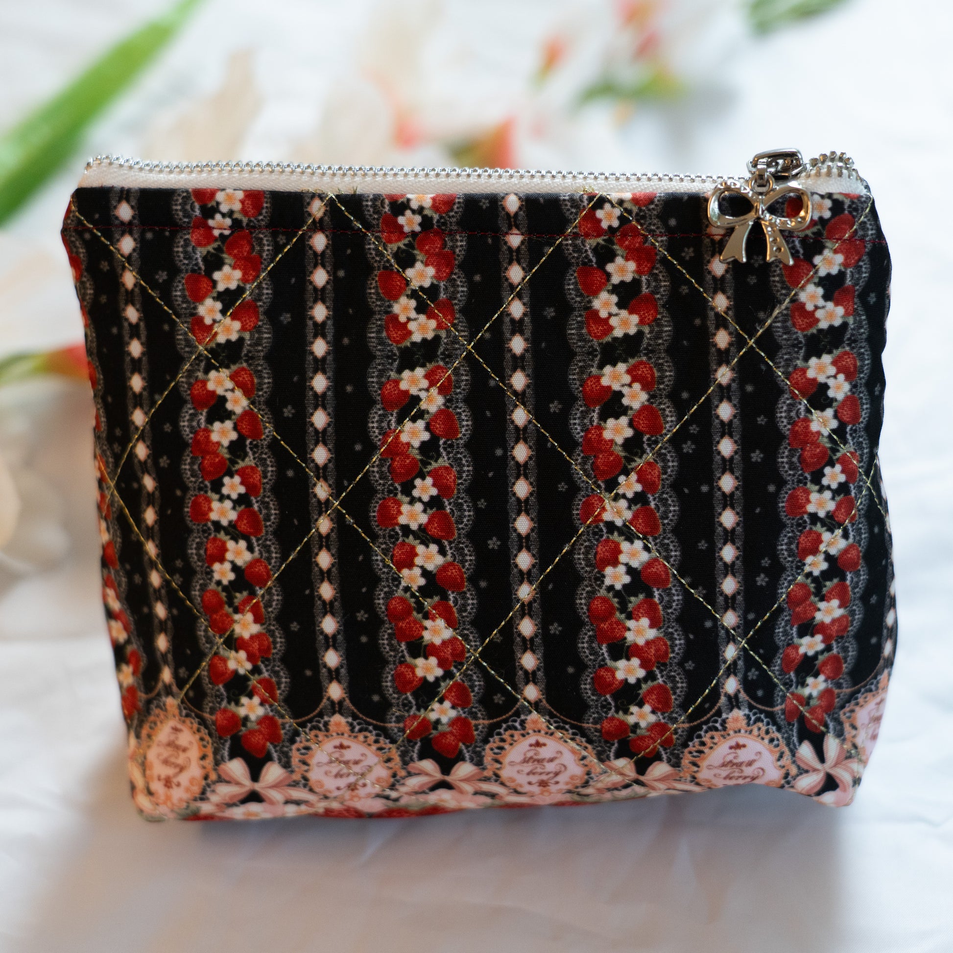 Indulge in sweetness with this adorable quilted makeup bag, featuring a delicate pink and strawberry dessert print! Perfect for fans of kawaii, lolita, and sweet-inspired fashion, this handmade pouch is ideal for storing cosmetics, accessories, or small essentials.
