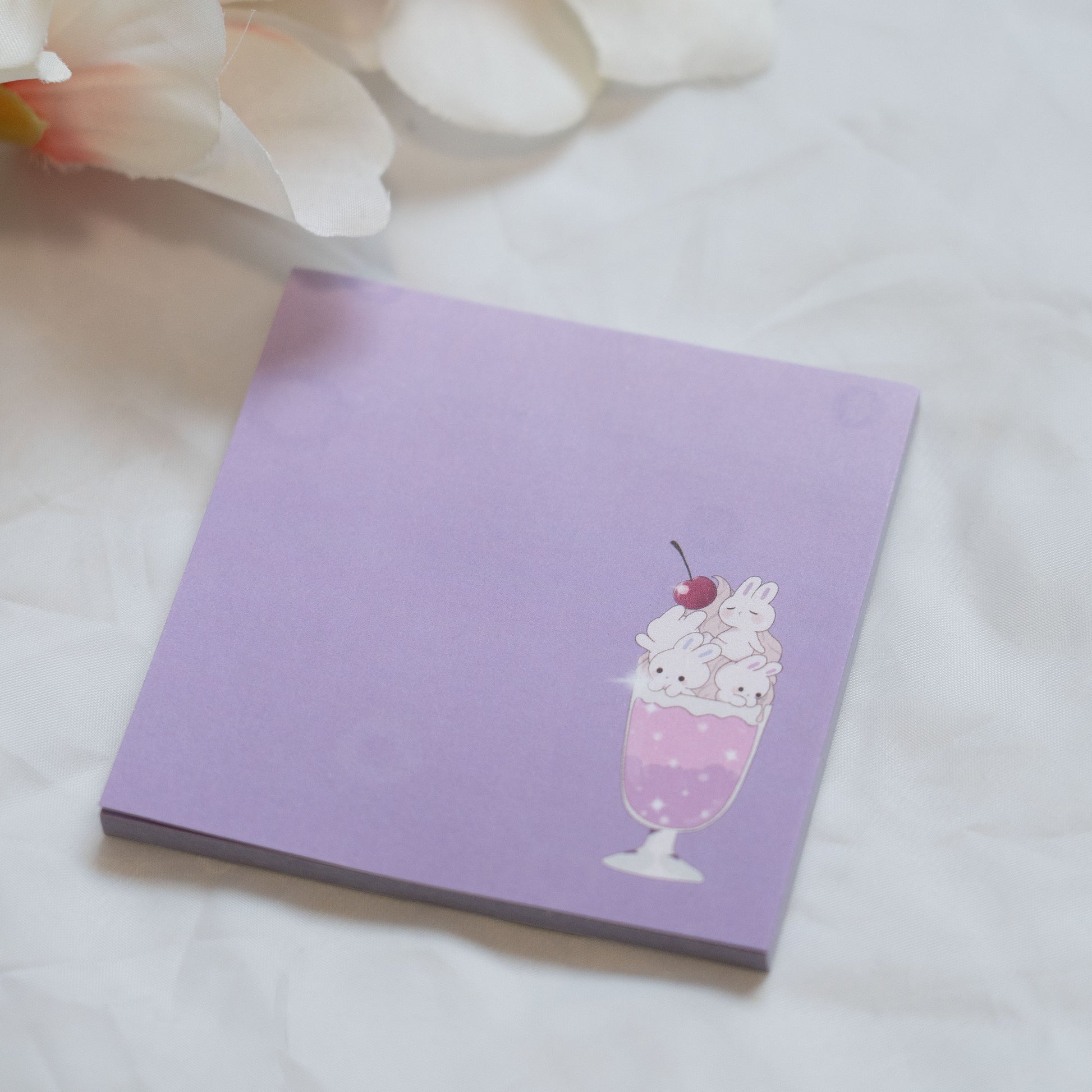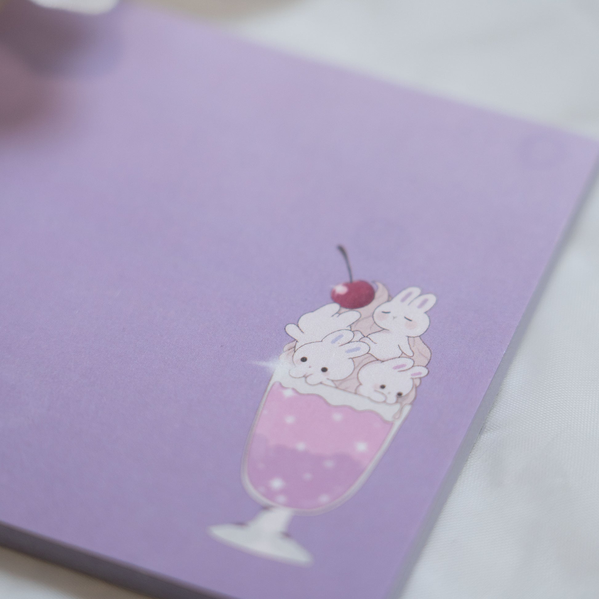 Design: Unique bunny dessert artwork on each page with a pastel purple theme.