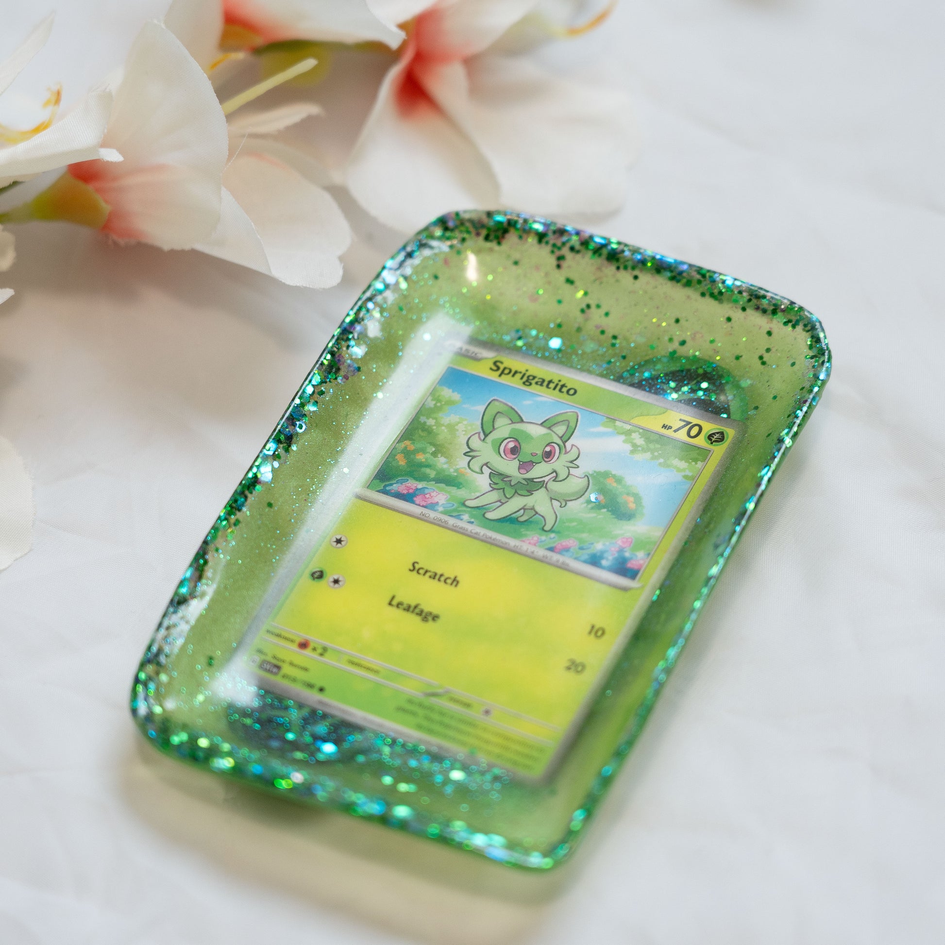Design: Features a Sprigatito Pokémon card encased in crystal-clear resin, surrounded by shimmering green glitter for a vibrant, earthy vibe.