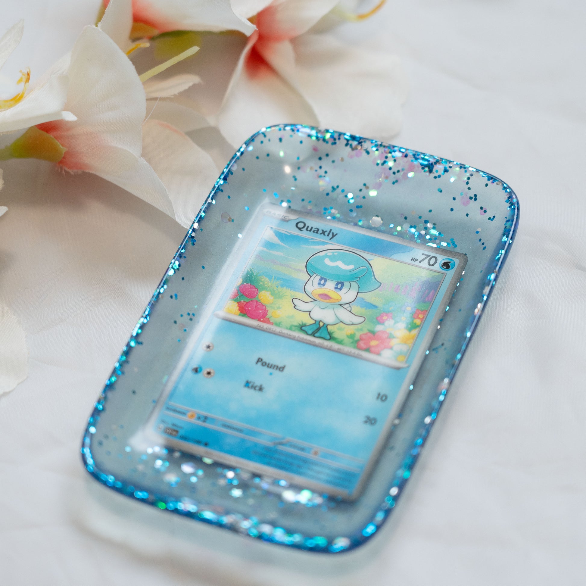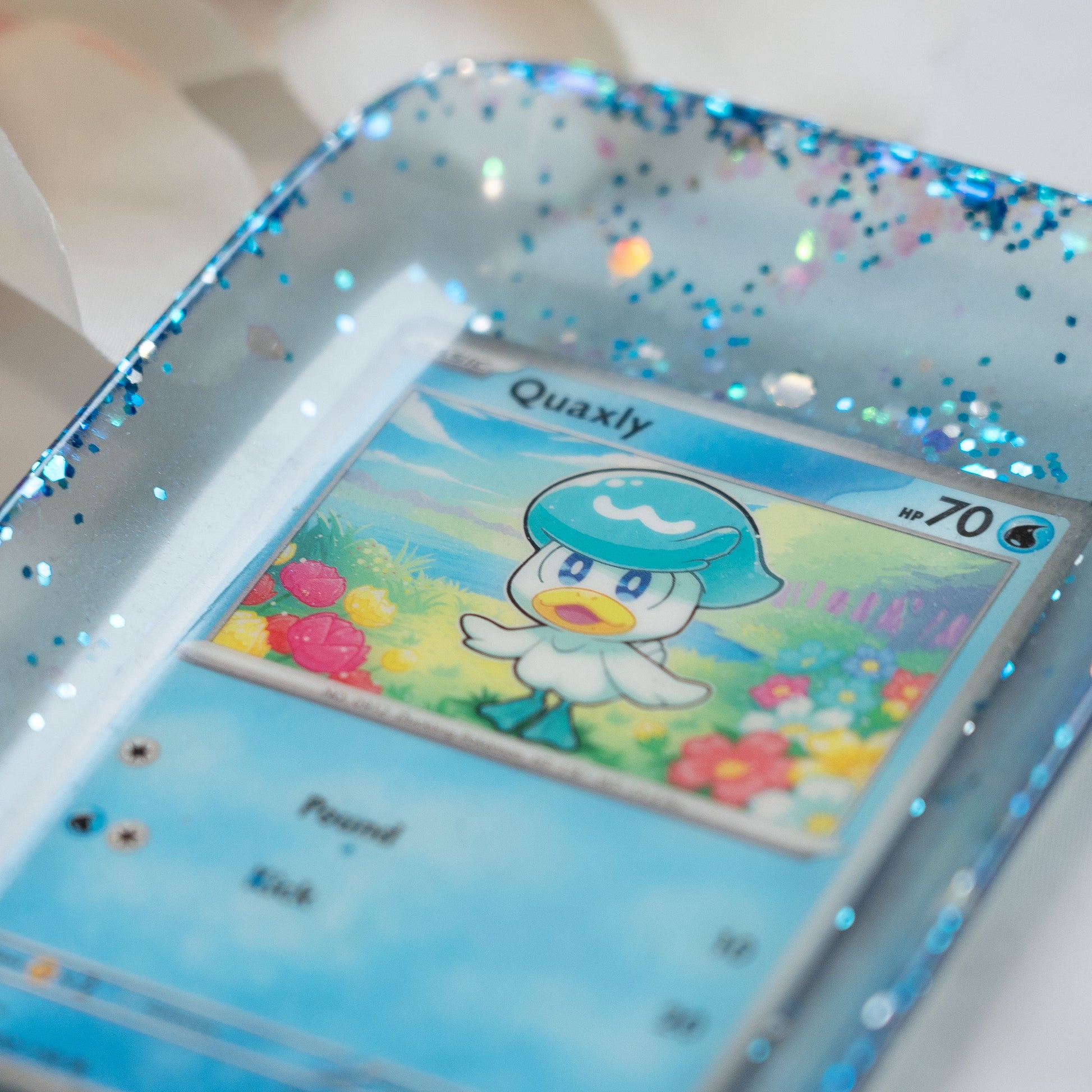 Design: A vibrant Quaxly Pokémon card encased in clear resin, surrounded by blue glitter and holographic accents for a shimmering effect.